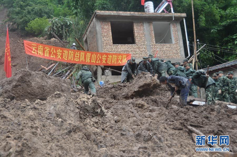 9月2日,云南保山公安边防支队赴瓦马乡抢险救援突击队官兵在现场进行挖掘,搜救被埋群众。