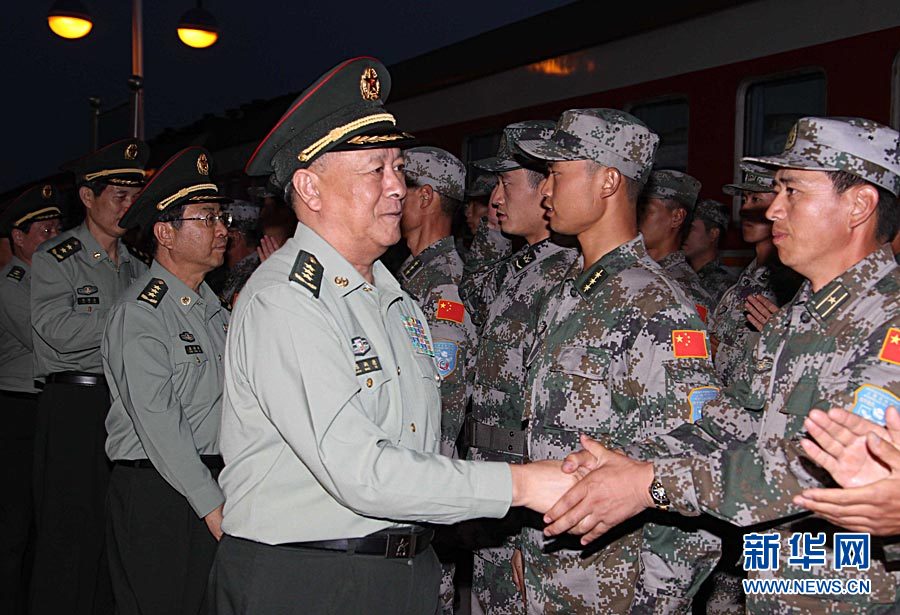 9月2日,中央军委委员、总参谋长陈炳德出席出发仪式,为参演官兵送行。当日,“和平使命-2010”上海合作组织成员国武装力量联合反恐军事演习中方参演部队出发仪式在北京军区朱日和合同战术训练基地举行。中方第五、第六批通过铁路输送的参演官兵,从朱日和火车站启程前往哈萨克斯坦境内演习地域。新华社记者王建民摄