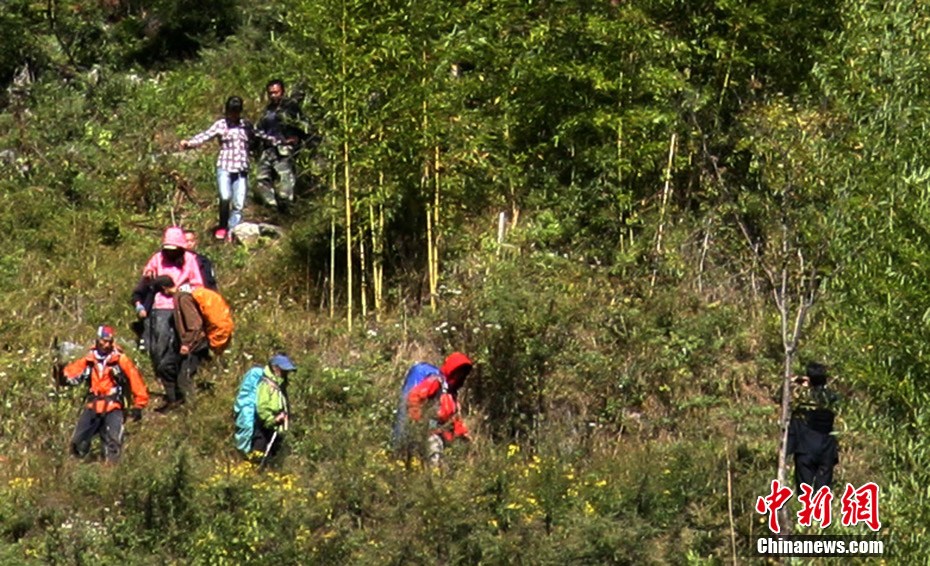 10月12日上午10时许,在四川省卧龙国家级自然保护区耿达乡正河沟半山腰,卧龙方面派出的搜寻队与失联12天的14人户外运动爱好者团队会合。随后,这批驴友被护送下山,并得到了精心照料。据了解,这批驴友由9名浙江、上海游客和1名四川当地高山协作、4名背夫组成,系违规登山。图为卧龙搜寻队接驴友下山。中新社发 何晓安 摄