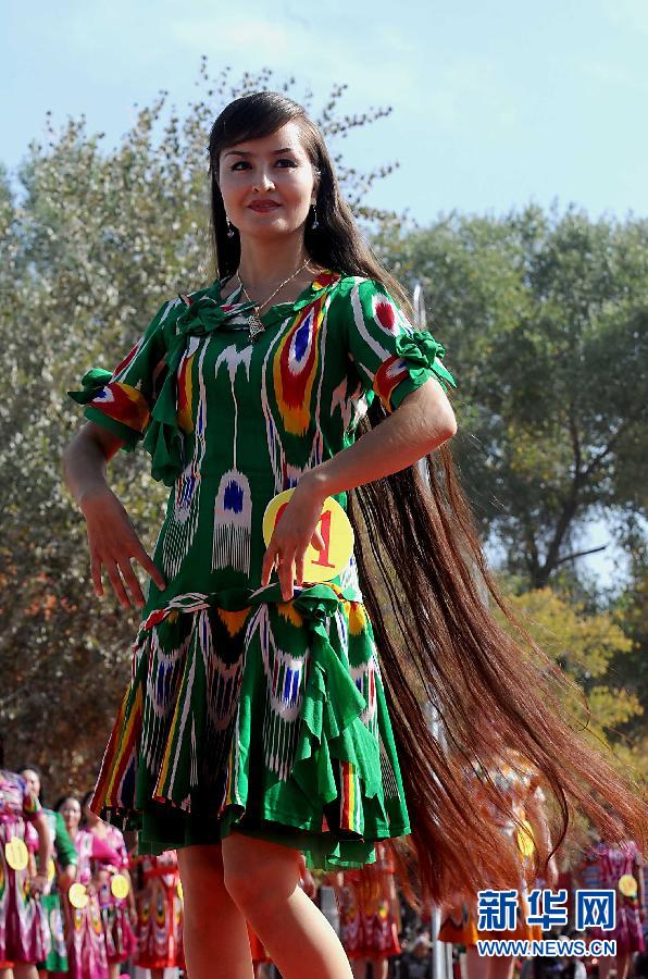 10月18日,一位长发飘逸的维吾尔族姑娘走上赛台。当日,新疆维吾尔自治区泽普县在金胡杨国家森林公园,举办一场独具民族特色的“长辫子比赛”。参赛的37名选手,头发长度都超过了1米,最长的达1.65米。新华社记者王颂摄