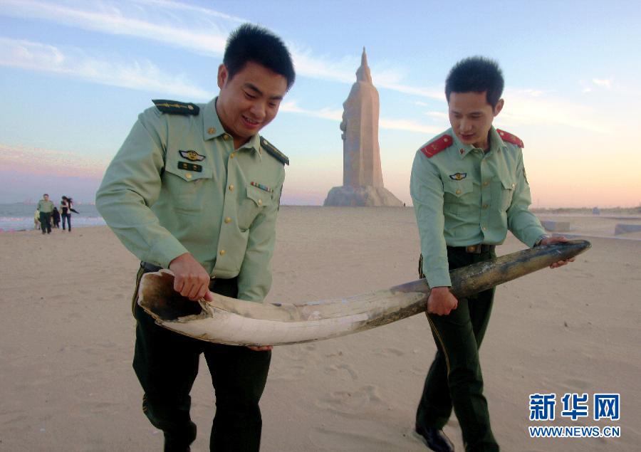 10月19日,边防官兵把象牙带回所里进行调查。当日,福建泉州边防支队衙口边防派出所接获群众报警,在福建泉州市晋江衙口海边发现一根象牙,随后民警将这根象牙带回进行调查。据测量,这根象牙长1.6米,直径最大达14厘米。经初步确定,这根象牙为野生象牙。目前,边防部门正对象牙做进一步鉴定,并调查其来源。 新华社发(李实 摄)