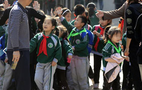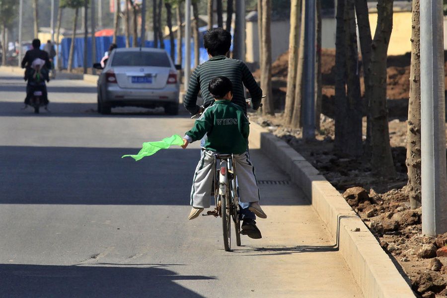 据介绍,学校委托制作红领巾的厂家,设计了同样大小的绿领巾,10月14日发放给没有入队的学生。学校九十多名一年级学生中,约有一半人都佩戴绿领巾。图为一个孩子坐上家人的自行车,便将绿领巾摘下。