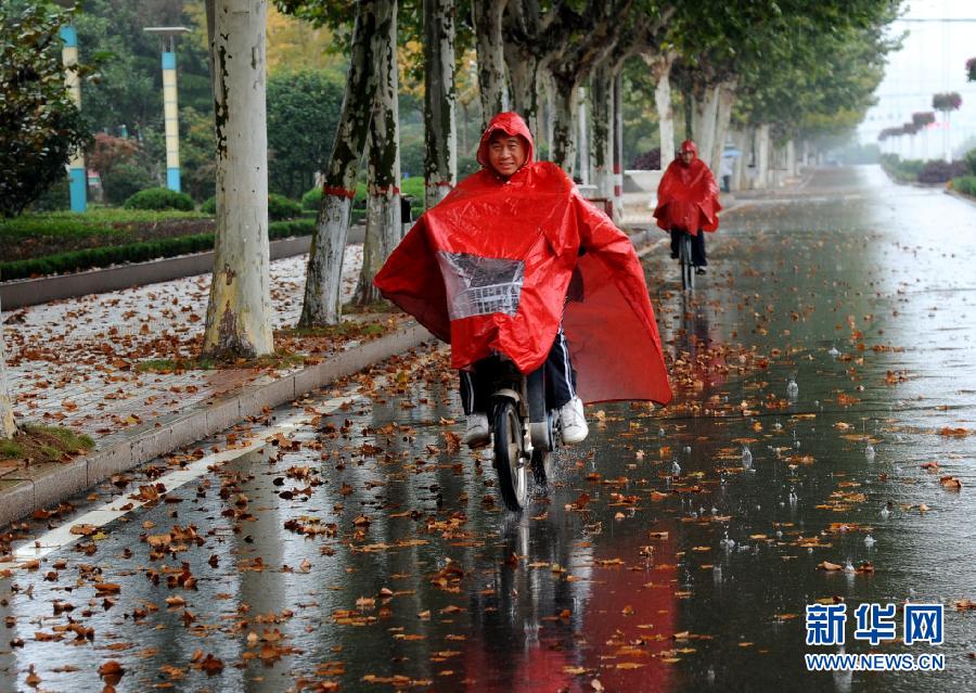 10月23日,山东省枣庄市山亭区市民冒雨骑行在落满秋叶的道路上。 当日,随着冷空气入侵,我国中东部部分地区迎来雨雪天气,气温骤降。新华社发(李宗宪 摄)