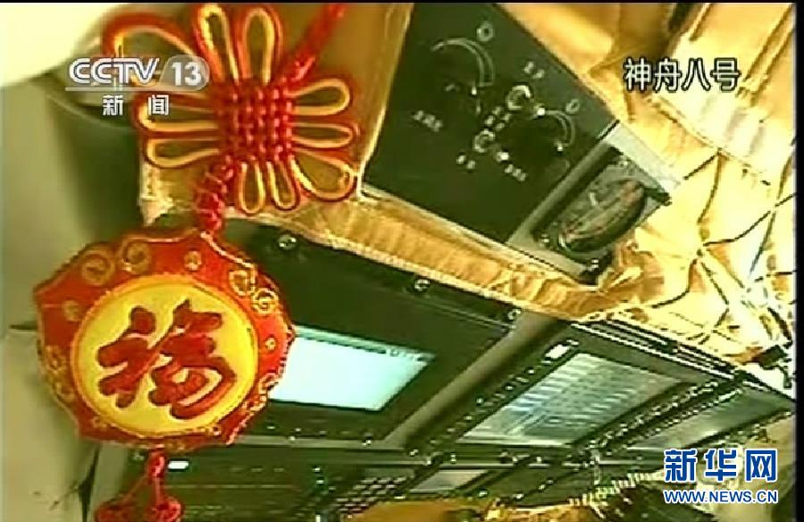 11月1日,神舟八号飞船在酒泉卫星发射中心升空。这是飞船内的中国结。新华社发(视频截图)