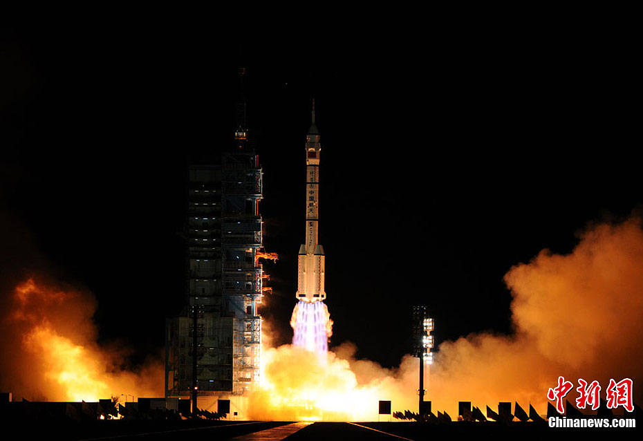 11月1日5时58分07秒,中国“长征二号F”遥八运载火箭在酒泉卫星发射中心载人航天发射场点火起飞,将“神舟八号”飞船发射升空。孙自法 摄