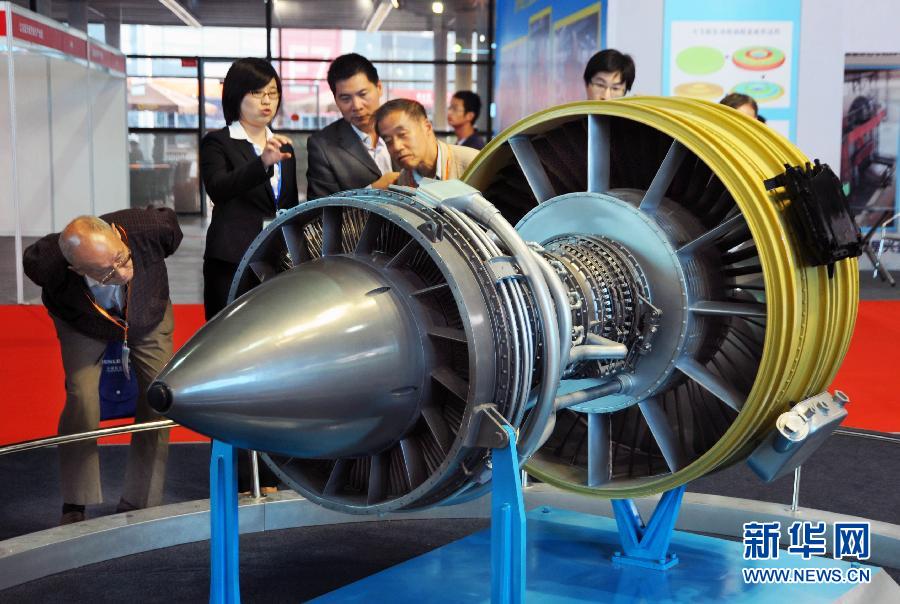 11月1日,观众在工博会上参观将装配在国产大飞机上的“长江”发动机模型。自当日起至11月5日,2011中国国际工业博览会在上海新国际博览中心举行。来自全球1800余家企业,展示了从高端装备制造到百姓日常生活的最新科技产品,吸引大批业内行家与市民的关注。新华社发(朱岚 摄)