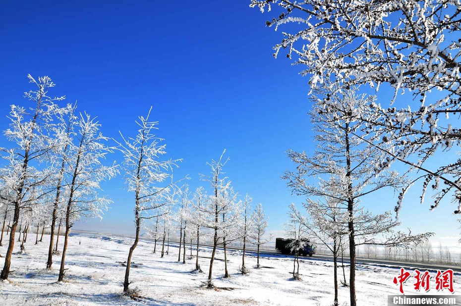 11月5日,内蒙古牙克石市出现雾凇美景。11月2-3日,内蒙古大部地区迎来入冬以来的第一场大范围降雨或雨夹雪天气。由于连续降温,牙克石市提前迎来雾凇景观。中新社发 余昌军 摄 图片来源:CNSPHOTO