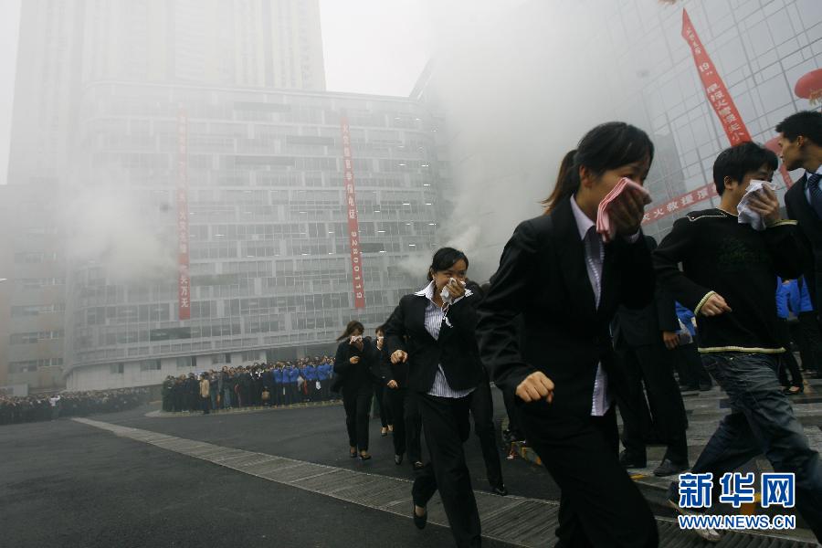 11月7日,在湖北武汉,人们在进行逃生救援综合演习。