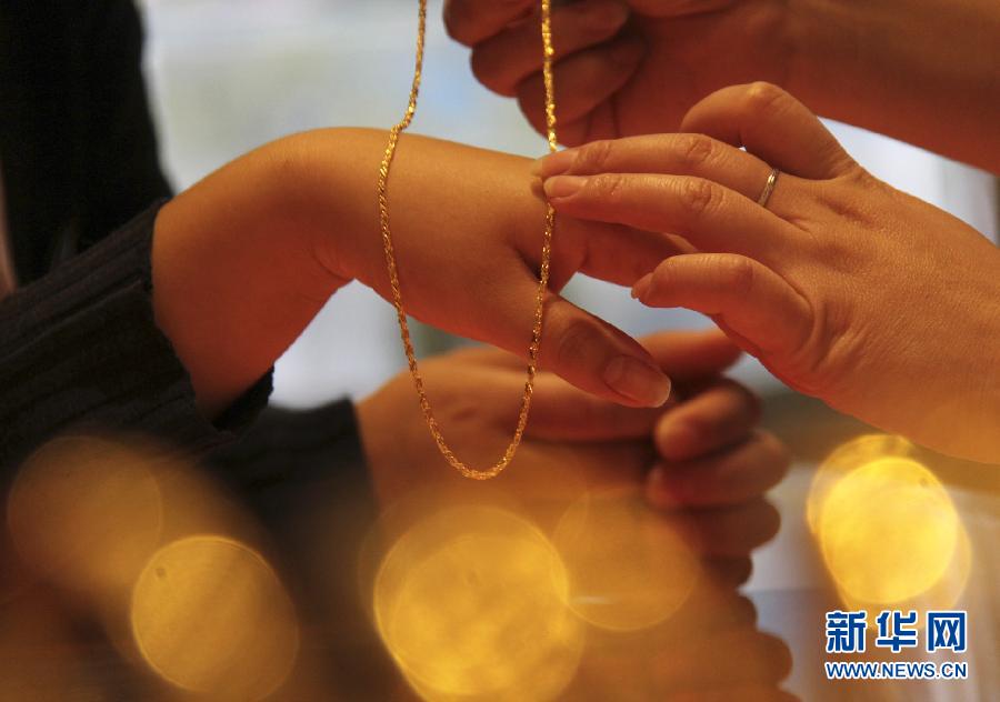 消费者在山东省临沂市郯城县一家金店试戴金饰(2011年10月21日摄)。当日,中国黄金协会会长、中国黄金集团公司总经理孙兆学在天津举行的“2011中国国际矿业大会”上预测,今年我国黄金产量将超过350吨,消费量则将达400吨。新华社发(张春雷 摄)