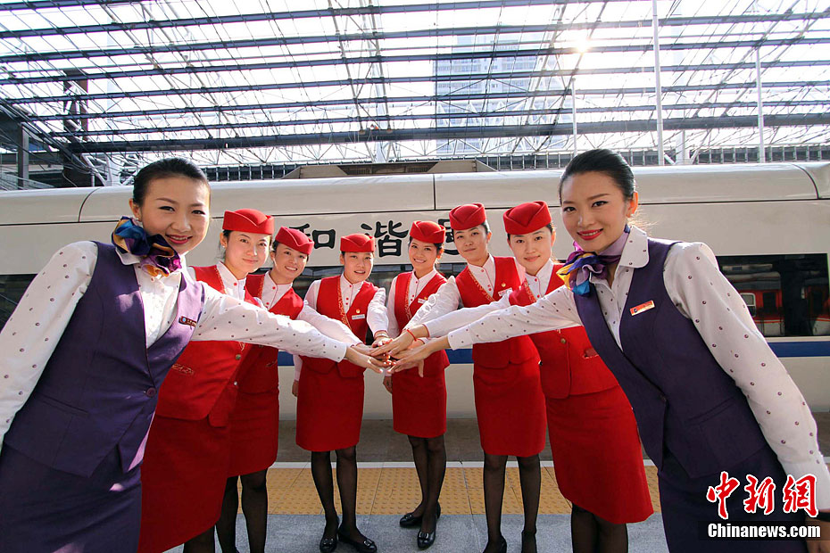 11月14日,一群青春靓丽的“空姐”登上福厦高铁,与南昌铁路局高铁乘务员——“动姐”进行了一番经验和技巧的交流。图为“空姐”“动姐”齐聚一堂,构成一道靓丽的风景线。雍万俊 摄