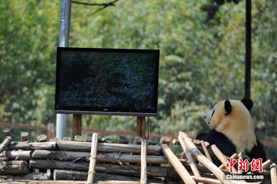 4月14日,正在看电视的大熊猫思嘉。近日,在云南野生动物园寄养的大熊猫美茜回四川后,单独留在昆明的大熊猫思嘉情绪低落,开始出现了许多反常举动。动物园想了许多办法,希望大熊猫思嘉能恢复正常。在6年前的5.12特大地震中,卧龙中国保护大熊猫研究中心严重受损,有3只大熊猫被送到到昆明寄养。中新社发 刘冉阳 摄