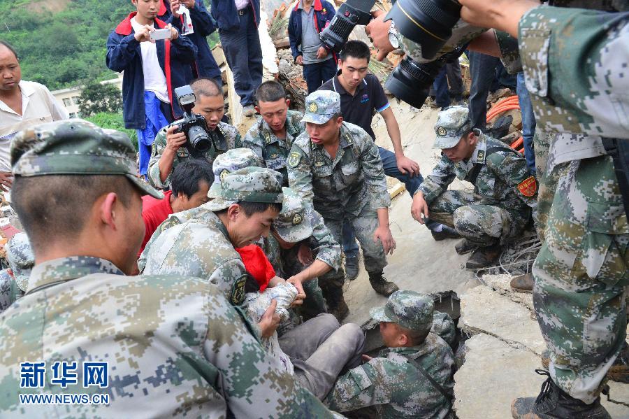8月4日,救援人员在抬出一名获救人员。当日,云南某预备役师应急救援一中队在鲁甸县龙头山镇成功救出一名被埋人员,并迅速送往救助站进行医治。 8月3日16时30分,云南省昭通市鲁甸县发生6.5级地震,震源深度约12公里。截至8月4日14时,地震造成昭通市鲁甸县、巧家县、昭阳区和曲靖市会泽县108.84万人受灾、398人死亡、3人失踪、1801人受伤、22.97万人紧急转移安置。新华社发(李进 摄)