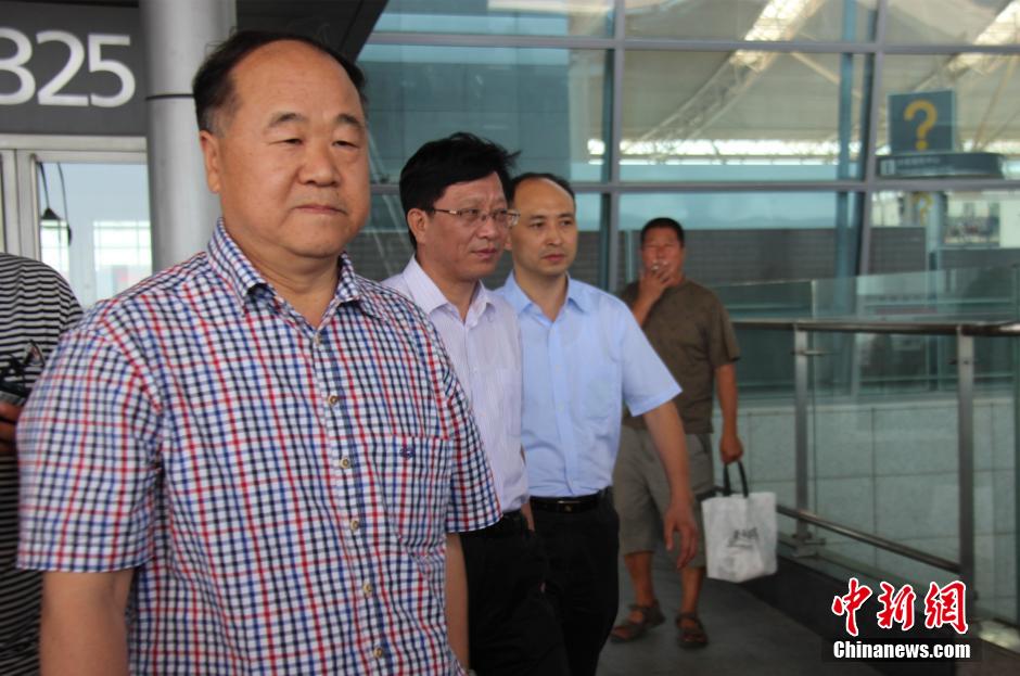 8月15日中午,莫言与法国文学家勒克莱奇奥分别乘飞机“空降”西安,两位诺贝尔文学奖得主将进行“长安与丝路”主题对话。图为莫言机场亮相。冀浩凡 摄