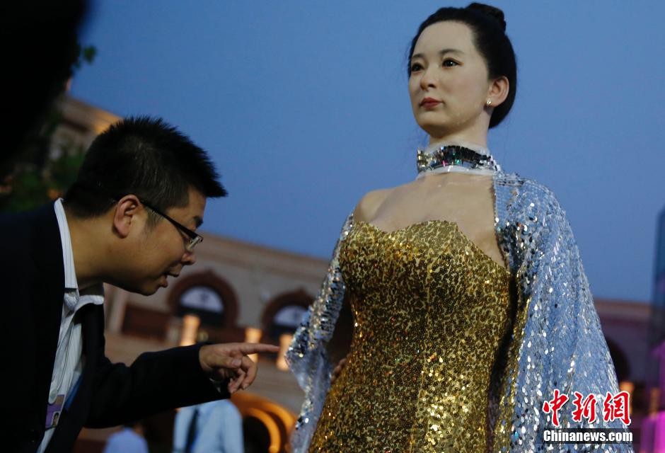 9月11日,天津民园体育场,高仿真美女机器人惊艳亮相。当晚,2014年天津夏季达沃斯论坛文化之夜晚宴在天津民园广场举行。中外嘉宾在这里欢聚一堂,在夜色中品尝天津本土美食,共赏文艺演出,感受这座城市迷人的魅力。 中新社发 佟郁 摄