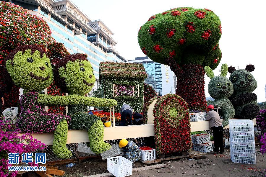 9月24日,工人在北京长安街西单路口搭建花坛。国庆节前,北京长安街西单路口的花坛开始搭建。 新华社记者 金立旺 摄