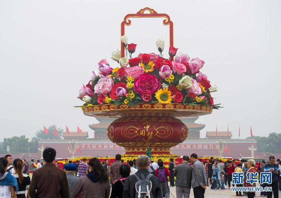 9月25日,游客在天安门广场欣赏 “祝福祖国”花坛。当日早晨6时起,天安门广场国庆花篮及花坛完整亮相。 新华社记者 罗晓光 摄