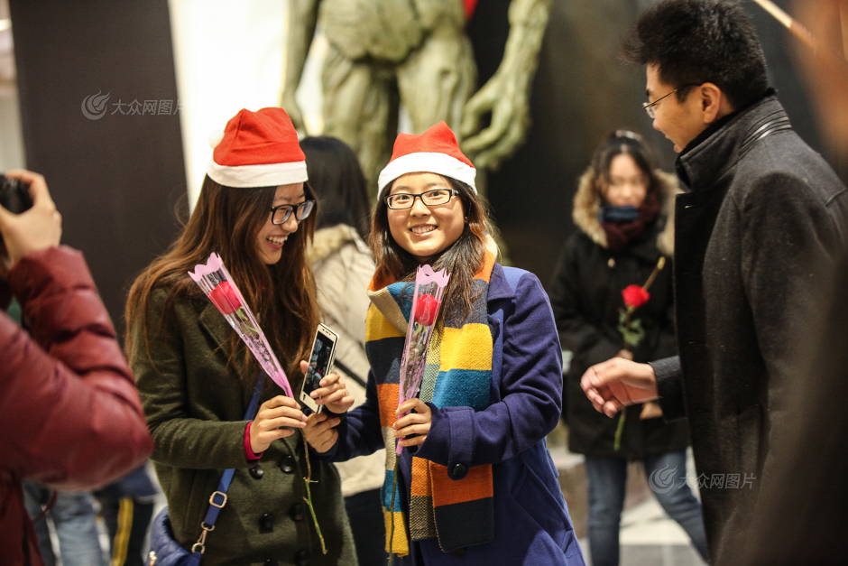 12月24日下午,在济南市泉城路,出现了非常温馨的一幕,一位男子手捧着一大把玫瑰花,一朵朵分送给路人。当日,是西方传统的“平安夜”,济南街头圣诞气氛浓烈。据了解,大众网推出“平安夜温情策划”为济南市民免费发放鲜花,送上温馨的祝福。记者 王长坤 摄