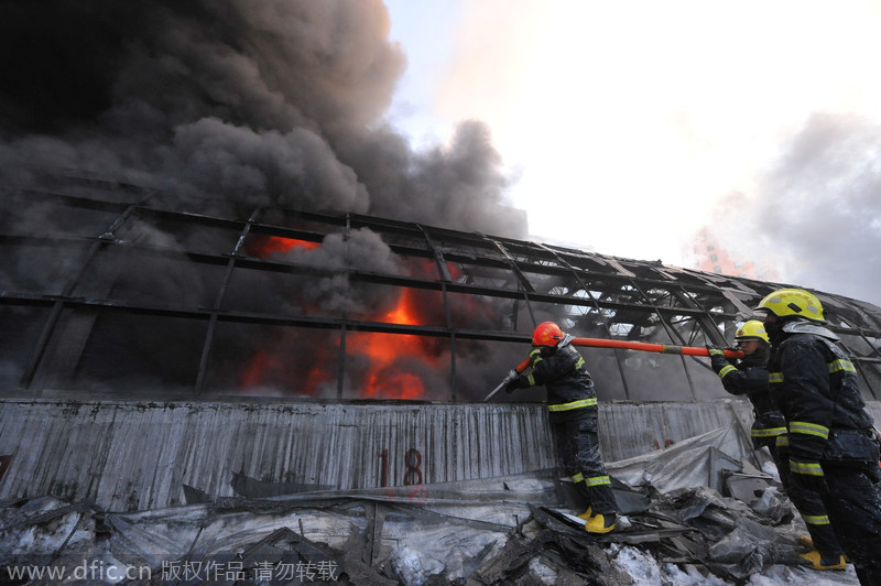 2015年1月2日13时,哈尔滨道外区南勋街与南头道街附近的一个存放厨具的库房起火,数公里外可见浓烟。图为哈市消防支队现场救援。