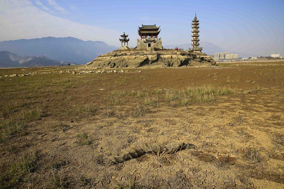 2015年1月3日,江西省九江市星子县,受上游来水减少和久旱少雨的影响,我国第一大淡水湖鄱阳湖逼近极枯水位,江西省星子县标志性景观落星墩“水落石出”,丰水期需要渡船才能前往观景台,现在步行就可以到达,吸引了游人们去游玩。
