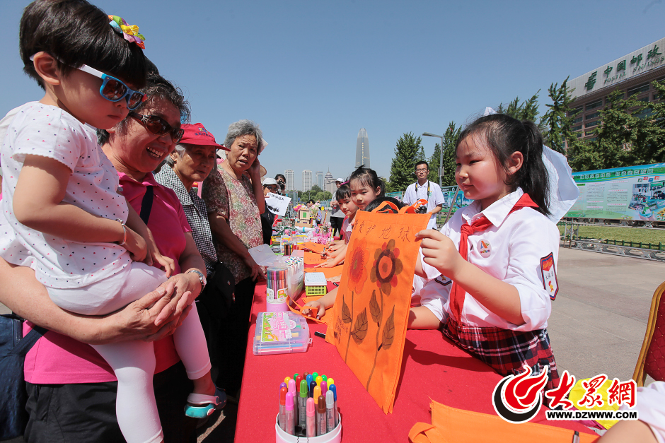 6月5日,济南泉城广场,来自龙奥小学二年级的学生现场作画,向市民宣传环保。当日,山东省暨济南市2015年世界环境日宣传活动在济南泉城广场举行。大众网记者 王长坤 摄