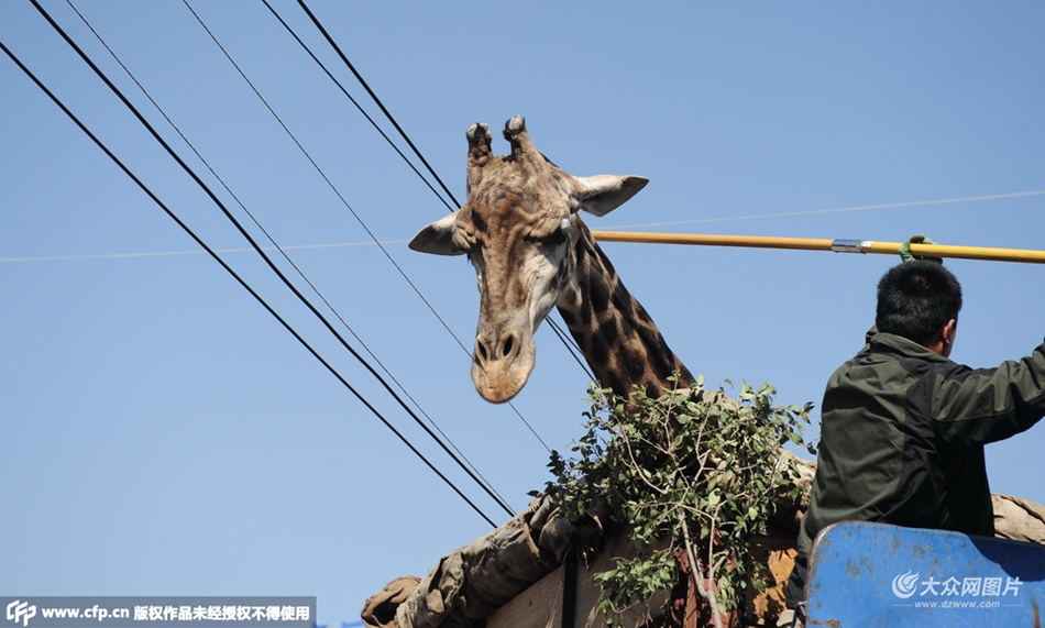 2015年10月9日,济南野生动物世界的8岁长颈鹿常青搬家。它坐上大卡车从700多米的山上老宅,一口气搬到七八十公里外位于章丘市的新家。