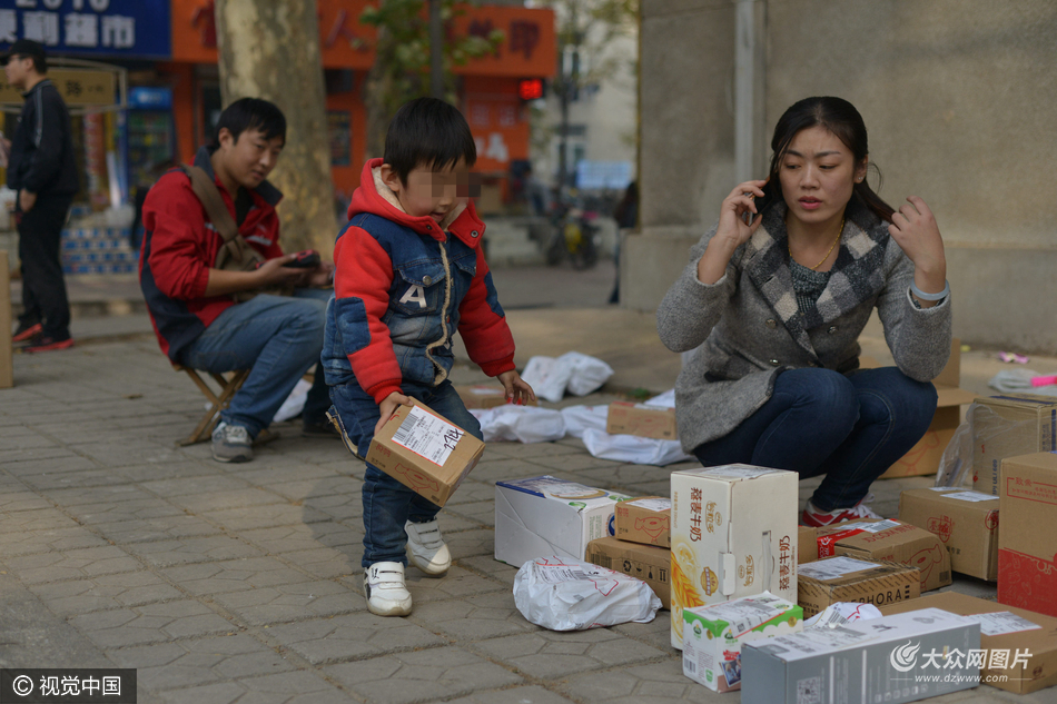 2016年11月13日,山东省济南市,双十一购物快递袭来 缺人手!全家齐上阵。在济南市山师校园内,双十一购物后的快递高峰到达,由于快递件数普遍较往日翻2~3倍,不少公司员工加派人手应对,更有全家总动员、齐上阵的景象出现,保证派件有条不紊,万无一失。
