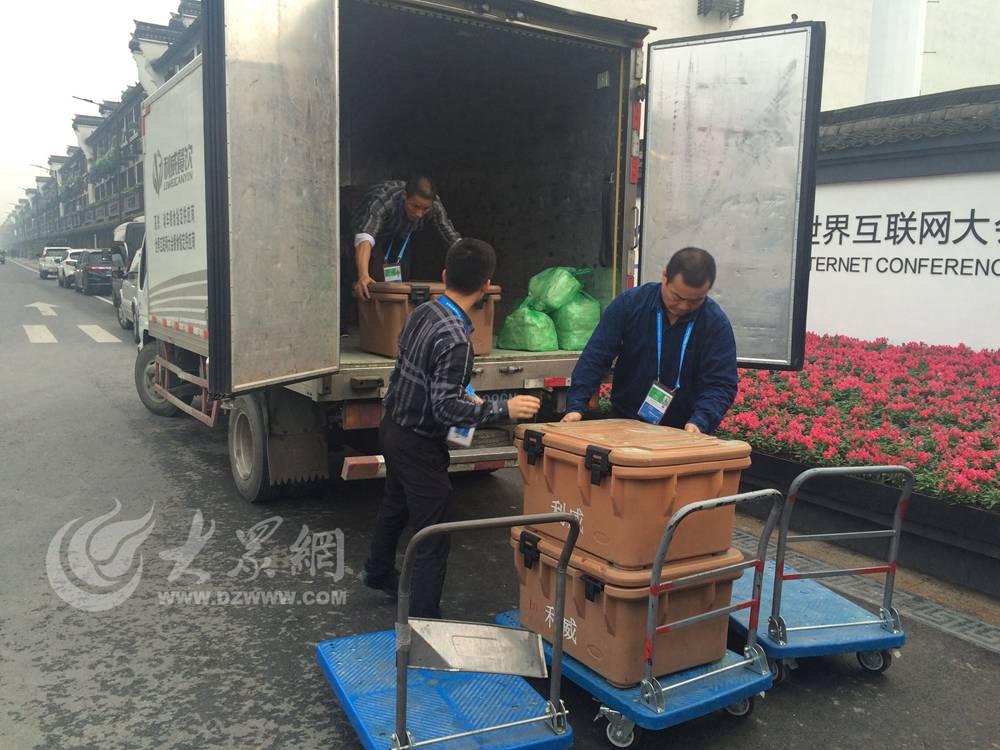 在乌镇互联网国际会展中心门前,大会指定餐饮供应商正在向会展中心供应膳食。大众网特派记者 李兆辉 摄