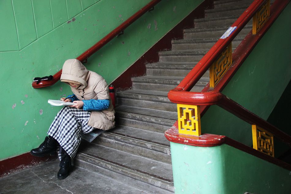 12月20日,山东师范大学二号教学楼楼梯口,室内温度1度,学生在腿上裹上小被子争分夺秒备战考试。实习生 孙明悦摄