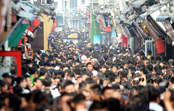 2017年10月3日,山东省济南市,在市区南大门的英雄山立交桥南下桥口处,从东、西、北三个方向行驶而来的车辆汇聚于此,排起百米长队缓慢通行,通过路口需要等待2-3个信号灯。国庆长假第三天,虽然天空飘着小雨,但市民外出旅游的兴致未减,自驾前往南部山区游玩的车辆增多,英雄山立交桥和省道103线车流量大幅增加,部分路段出现短时拥堵。