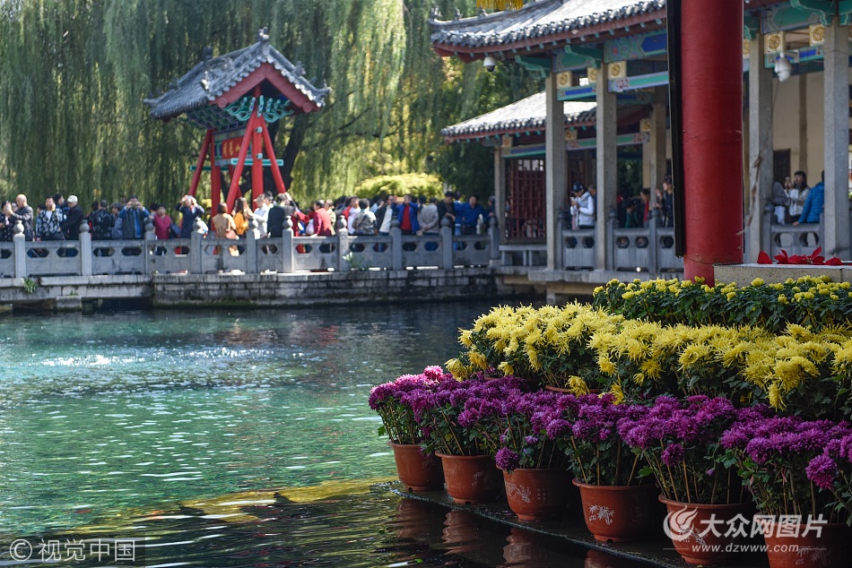 2017年10月24日,泉城济南趵突泉公园内,各种菊花千姿百态、争相斗艳,浓厚的深秋氛围,吸引了大批游客在济南传统的菊花节前夕提前赏菊游园。25日,第38届趵突泉金秋菊展如期举行,园内菊花将多达10万余盆。同往年一样,今年的菊展也将持续一个月。