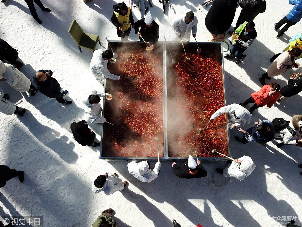 2017年12月24日,河南洛阳栾川伏牛山滑雪场,气温零下10摄氏度,数百民众围在一个边长3米多面积达10平方米的自制"土火锅"前,免费享用火锅盛宴。据了解,这个超级土火锅容纳的汤料重达3吨,所用食材达上百种,包括当地山区的土鸡、山羊肉、炸丸子、山蘑菇、栾川豆腐、山野菜等。 王中举(河南分社)/中新社/视觉中国