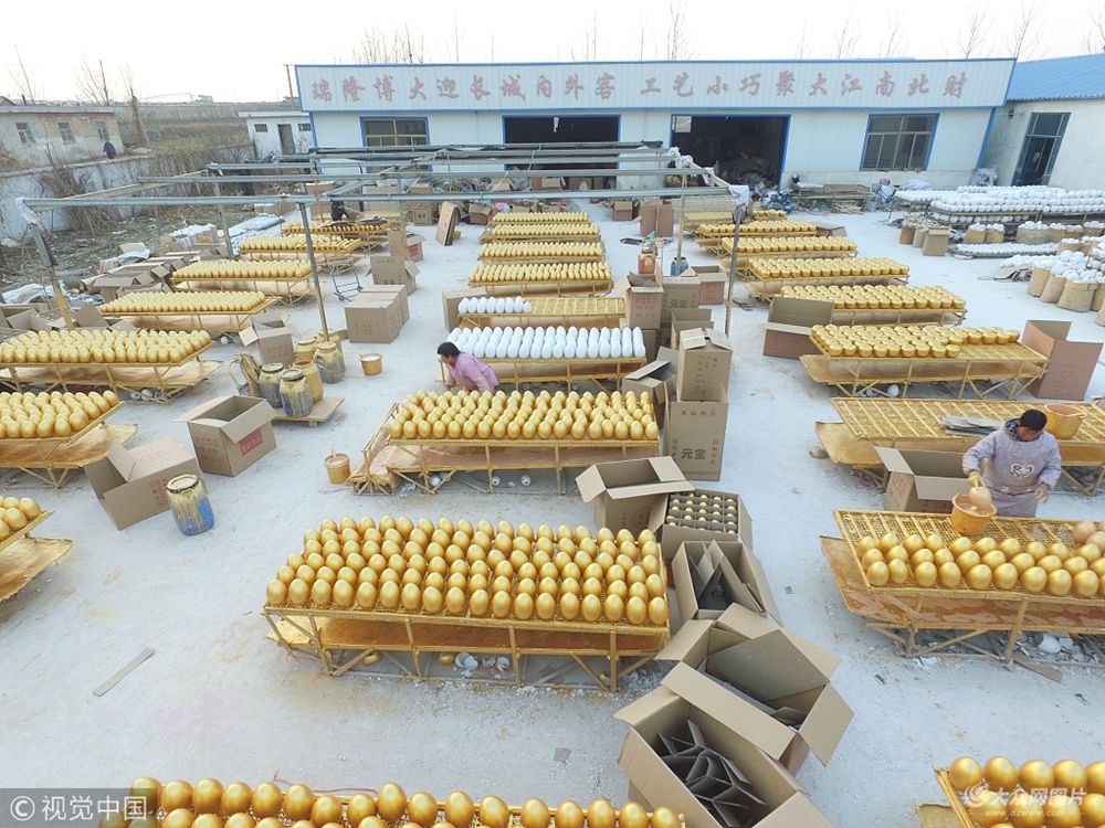 2017年12月27日,山东临沂,费县的水湖村家家户户开始囤货了,从十月一到现在金蛋产业一直处于旺季。特别是马上元旦了很多商家搞活动,蛋都做不上卖。据悉该村金蛋生意在2013年开始进入到快速增长阶段,到目前为止,每天有30万枚金蛋从水湖村销往全国各地,产值近3亿元。