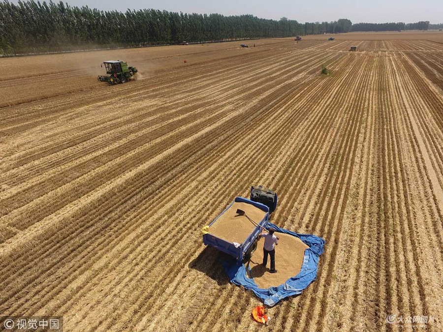 聊城:小麦陆续开镰收割 航拍农民抢收图
