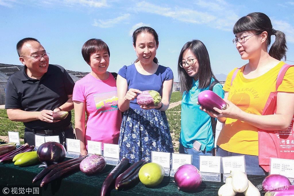 2018年6月21日,北京市农业局种子管站在昌平区马池口镇的北京农作物品种试验展示基地举办了2018年茄子品种展示会,来自国内21个省市自治区以及荷兰、日本等国家的117家单位参展,除了人们常见的紫黑色圆茄、长茄外,还有白色、绿色、彩条等多种颜色,从扁圆到灯泡,从短棒、长棒到线条形等569个“婀娜多姿”的茄子品种纷纷亮相,既为京郊农民提供更多种植选择,也丰富市民的“菜篮子”,吸引了许多各地的业内人士和市民前来观摩和参观。图片作者:陈晓根/视觉中国