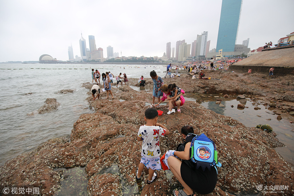 2018年7月20日,游人在青岛栈桥景区赶海拾趣。夏日炎炎,栈桥避暑旅游火爆,退潮时滩涂礁石区大批游人捉螃蟹挖蛤蜊摸鱼儿,享受大海乐趣清凉度夏。