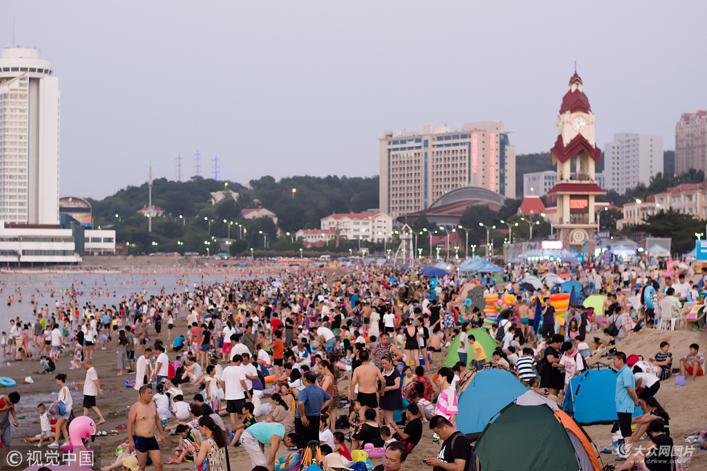2018年8月4日,山东烟台,傍晚时分,不少市民避开白天的烈日来到海水浴场下海乘凉。图片作者:刘臣臣/视觉中国