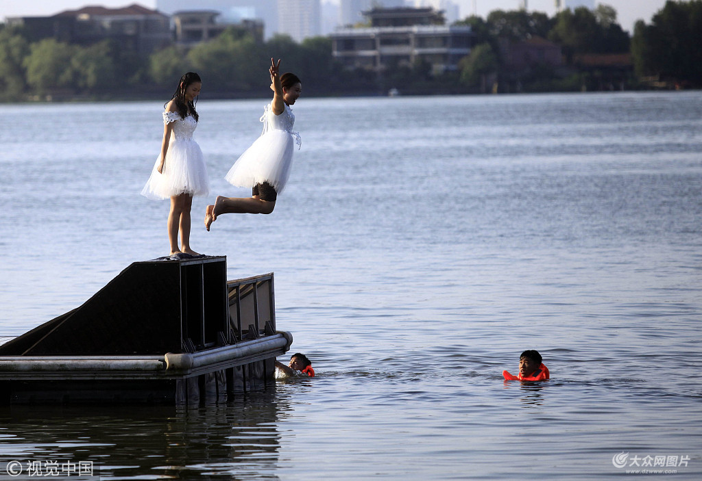 武汉上演传统项目“跳东湖” 市民穿婚纱戴面具花样百出放飞自我