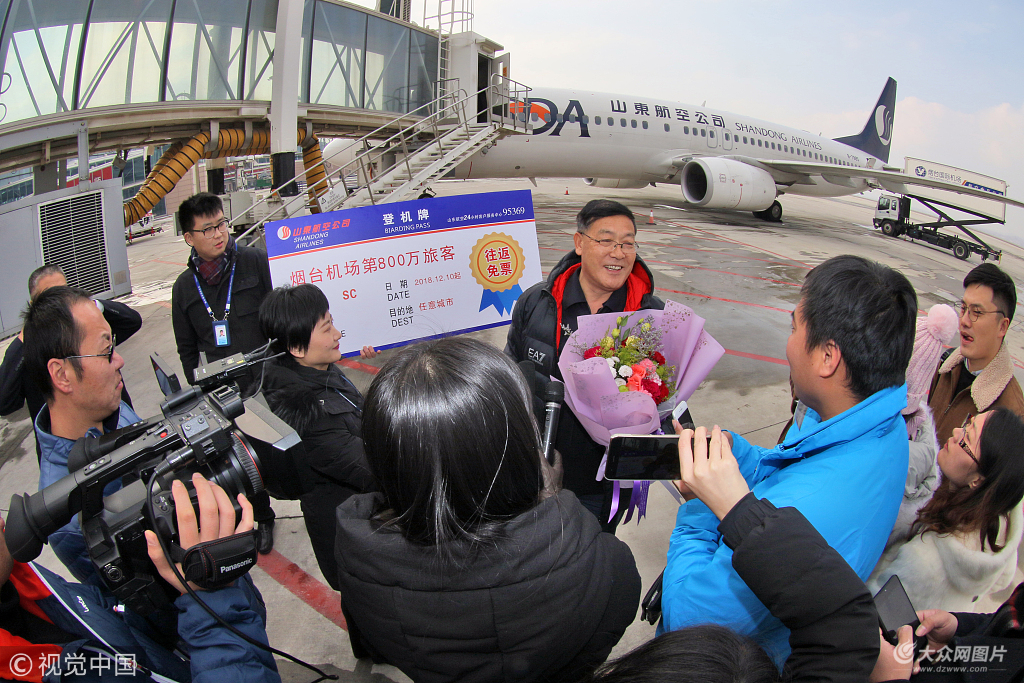 2018年12月10日,山东烟台蓬莱国际机场,2018年度第八百万名旅客姜善模接受媒体采访。