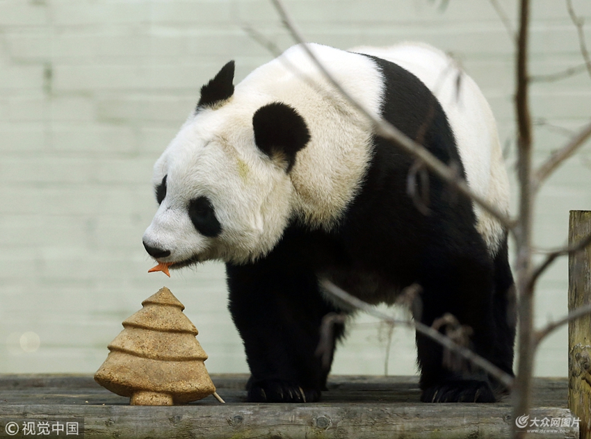 英国苏格兰爱丁堡,爱丁堡动物园中的大熊猫甜甜享用特制的圣诞树形状的蛋糕,迎接圣诞节到来。