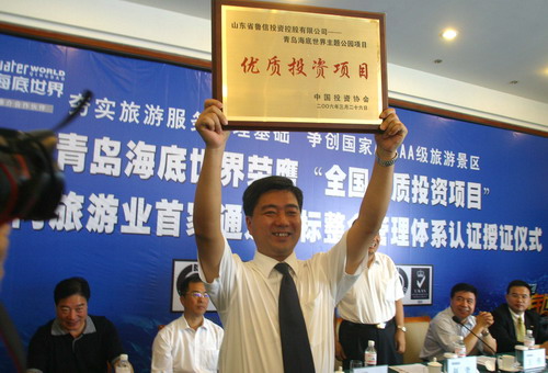 记者获悉,由于投资回报率高,再加上品牌和服务特色鲜明,进行海洋科普等获得良好的社会效益,青岛海底世界主题公园项目被中国投资协会评为“全国优质投资项目”。仪式现场,山东省鲁信投资控股集团有限公司董事长赵奎代表投资方将“青岛海底世界主题公园项目荣获优质投资项目”荣誉证书颁发给青岛海底世界总经理李鹰。