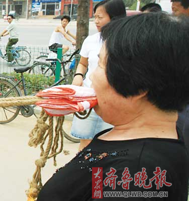 7月18日中午,济南济微路。济南72岁的老太太王小贝表演了令市民惊叹的一幕:用牙齿拉动载人后超过4吨的卡车,一直行走了十几米。 王小贝家住济南市王官庄小区,曾经是银行职员,如今她是一家知名会计师事务所的国家注册会计师。 30多年来她坚持叩齿和武术锻炼,至今身体很棒。去年冬天,她先后用牙齿拉动了一辆和两辆轿车,经过数月的持续锻炼,18日成功拉动载十多人、总重超过4吨的卡车。这位老人还在继续努力,力争拉动更重的大货车甚至火车车厢。 本报记者 周青先 摄影报道