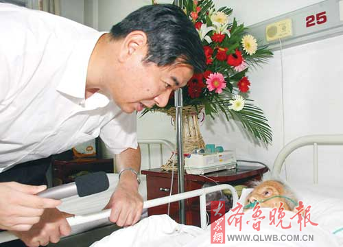 今天下午3点30分,副省长王军民在省卫生厅有关领导陪同下,到千佛山医院看望了王美容老人。进入病房之后,王军民先是细心地询问老人的身体状况,又向周围的护士询问了近期的治疗情况。王军民拉着王美容老人的手说:“现在你的儿子也回来了,你好好养病,安心住院,不要着急,有什么困难大家一块儿克服。”