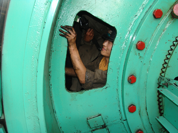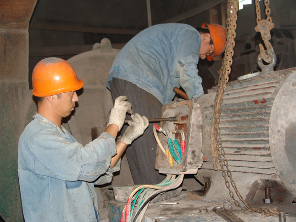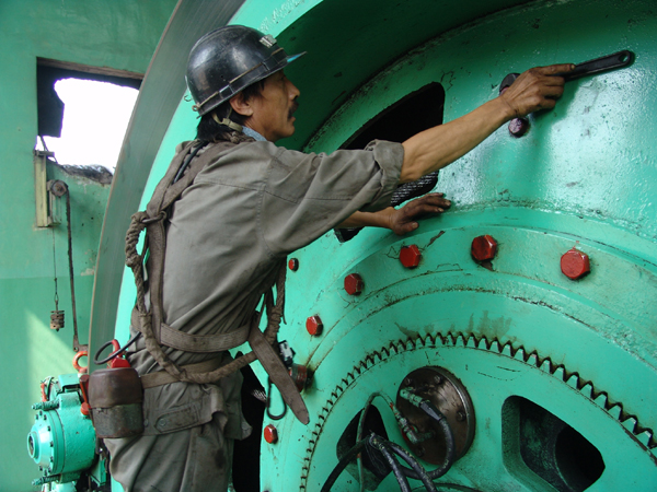 北皂煤矿员工不怕脏、不叫累,正在为主井绞车更换主提升绳,高质量地完成了检修任务,为矿井安全生产提供了保障。