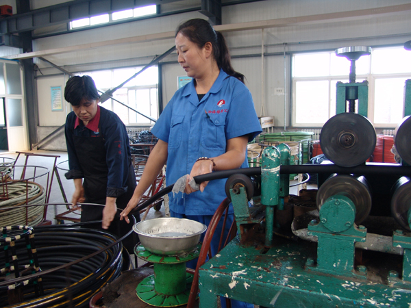 渤海橡塑有限公司节日期间生产不断线,广大员工坚持高标准、高质量地完成本职工作,确保让用户买到合格、满意的产品。图为该公司员工在为产品擦拭隔离液。
