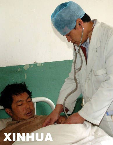 11月28日,医护人员给在昌源煤矿瓦斯爆炸事故中一位受伤人员进行身体检查。11月27日,以国家煤矿安全监察局局长赵铁锤为组长的国务院工作组抵达富源县。在昌源煤矿,赵铁锤与富源县县长、煤矿技术员和分管副县长先后进行的对话,折射出这起偶然事故背后的必然。11月25日,云南省富源县后所镇昌源煤矿发生瓦斯爆炸事故,造成32人遇难、28人受伤,事故引起了各界的广泛关注。新华社记者王长山摄