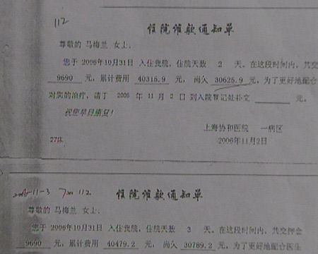 两天之内,吴女士夫妇便在上海协和医院花费了四万多元。出院时,她们接到医院通知:欠费了。