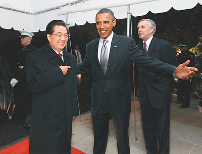1月18日,国家主席胡锦涛出席美国总统奥巴马在白宫举行的私人晚宴。这是胡锦涛主席抵达时,受到奥巴马总统的热情迎接。 新华社发